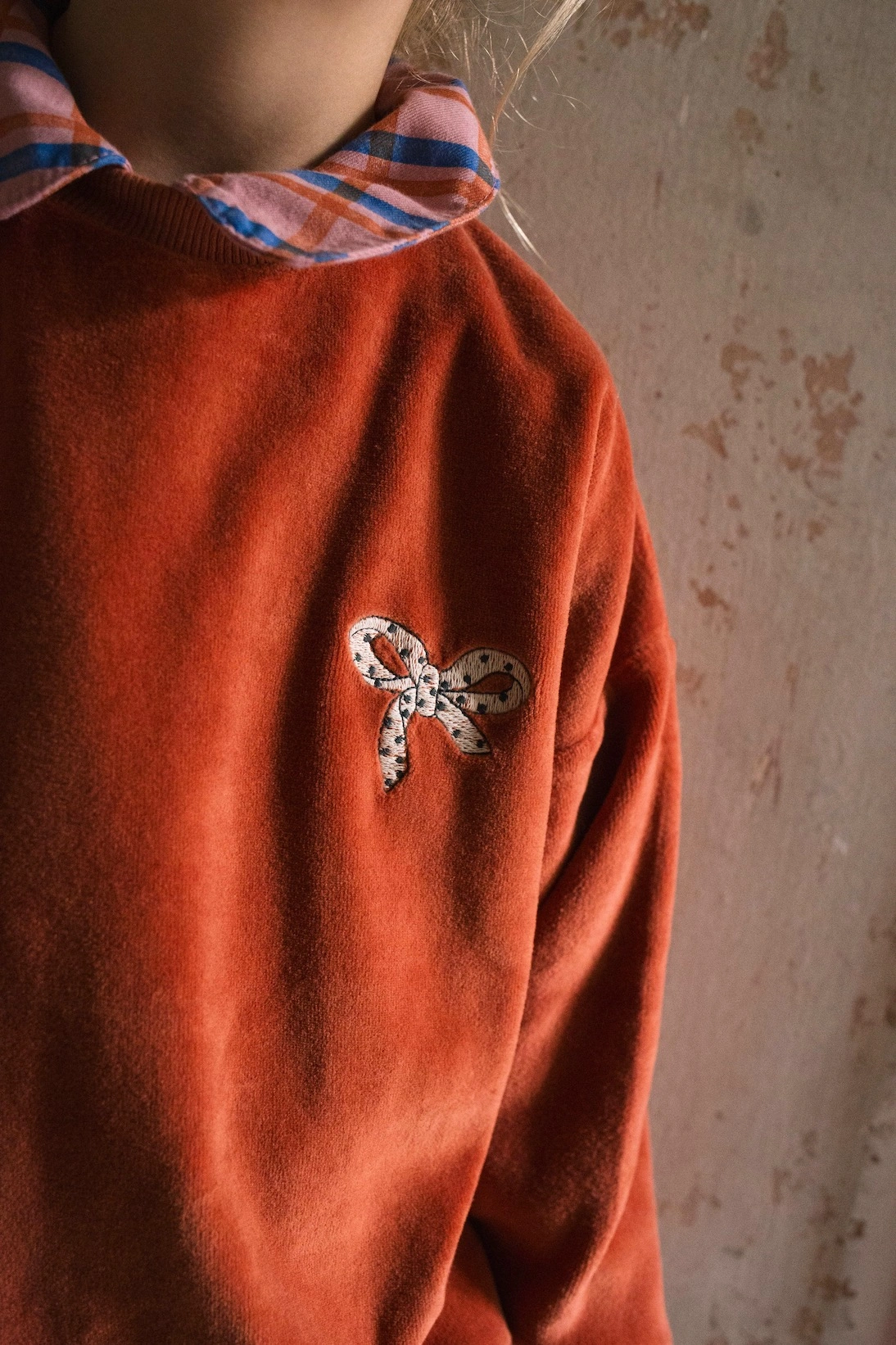 Discover more about the Sustainable lotiekids Bow embroidery Clay colour sweatshirt organic cotton made in Barcelona